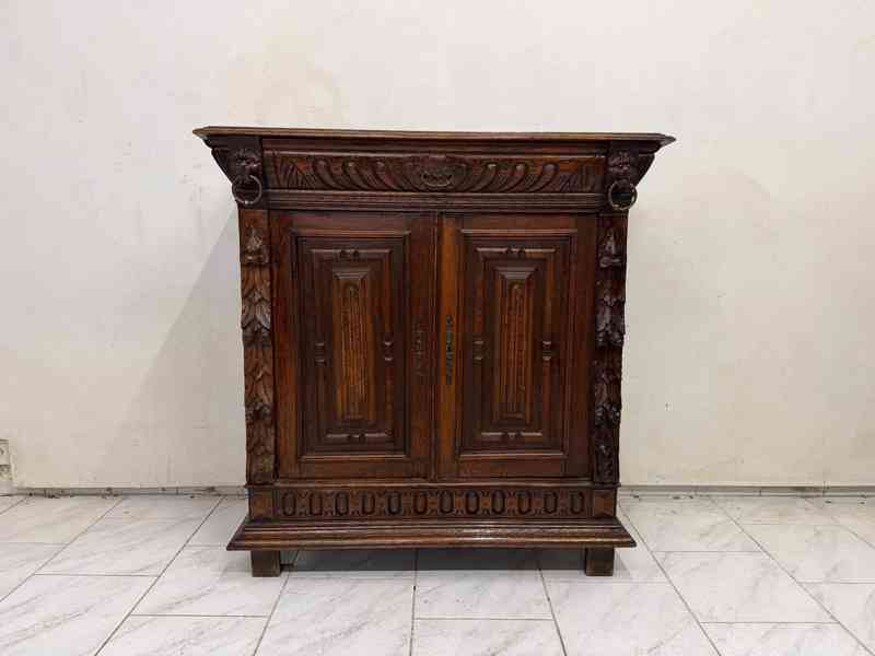 Starožitná masivní skříň Mechelen ● řezby typické pro Mechelen nábytek ● lví hlavy s kroužky ● původ Belgie ● období historismus – vyrobena cca 1910 ● zachovalý, předrenovační stav