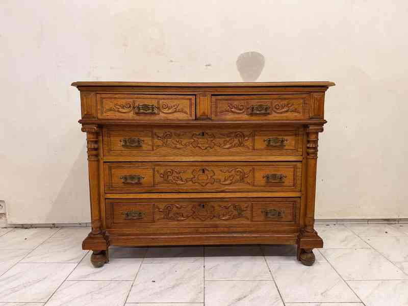 Starožitná masivní komoda Henri II. ● dubové dřevo ● neorenesanční styl ● mosazné kování ● vyřezávané sloupy ● původ Francie ● období historimus ● +- 1900