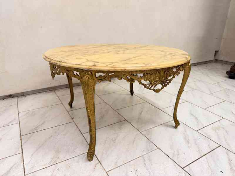 Mosazný stolek v barokním stylu ● onyxová deska ● povrch na 2 místech mírně poškozen, viz. foto ● vyroben ve třetí čtvrtině dvacátého století ● původ Holandsko
