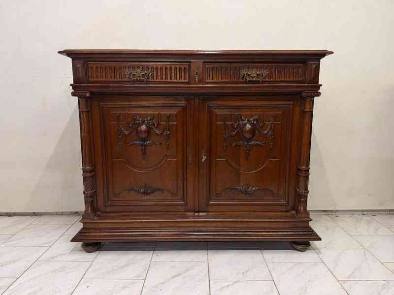 Starožitný bufet v novogotickém stylu ● jemně zdobený ● spousta úložného prostoru ● inspirovaný novogotickým slohem ● původ Holandsko ● vyroben ve třetí čtvrtině dvacátého století