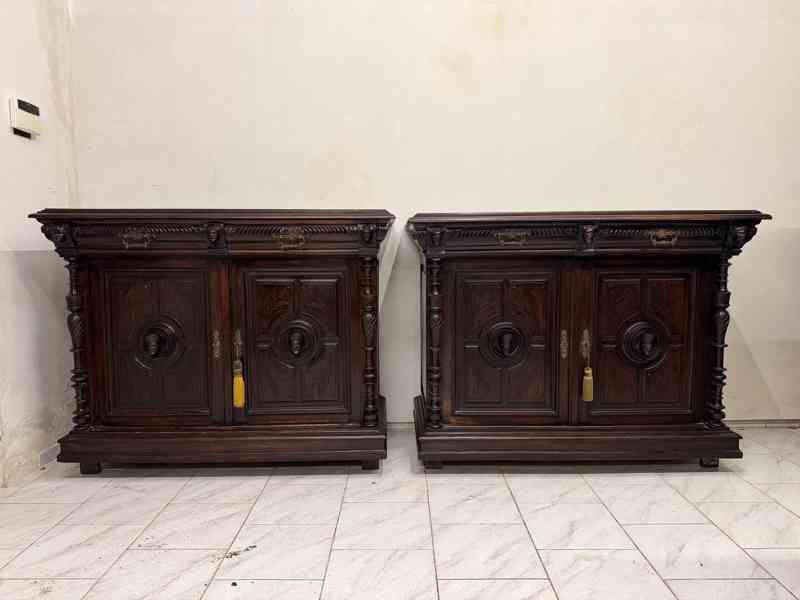 Starožitné masivní skříně Henri II. ● dubové dřevo ● neorenesanční styl ● mosazné kování ● vyřezávané sloupy ● původ Francie ● období historimus ● +- 1900 ● cena za oba kusy