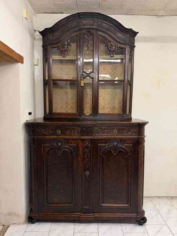 Starožitný zámecký příborník ● impozantní kus nábytku ● bytelný ● bohatá řezbovaná výzdoba průčelí ● masivní tmavé dubové dřevo ● velké prosklené dveře ● původní zámky a kování ● 4x klíč ● dominantní kus do velké jídelny ● styl pozdní historismus, neorokoko ● původ Francie ● datace konec 19. století ● složený ze 2 částí ● lze kompletně rozebrat na několik částí - velmi neobvyklé ● na fotografie se nepodařilo zachytit celkový objem z příborníku. Jedná se o velmi mohutný kus, který ve skutečnosti vypadá mnohem majestněji